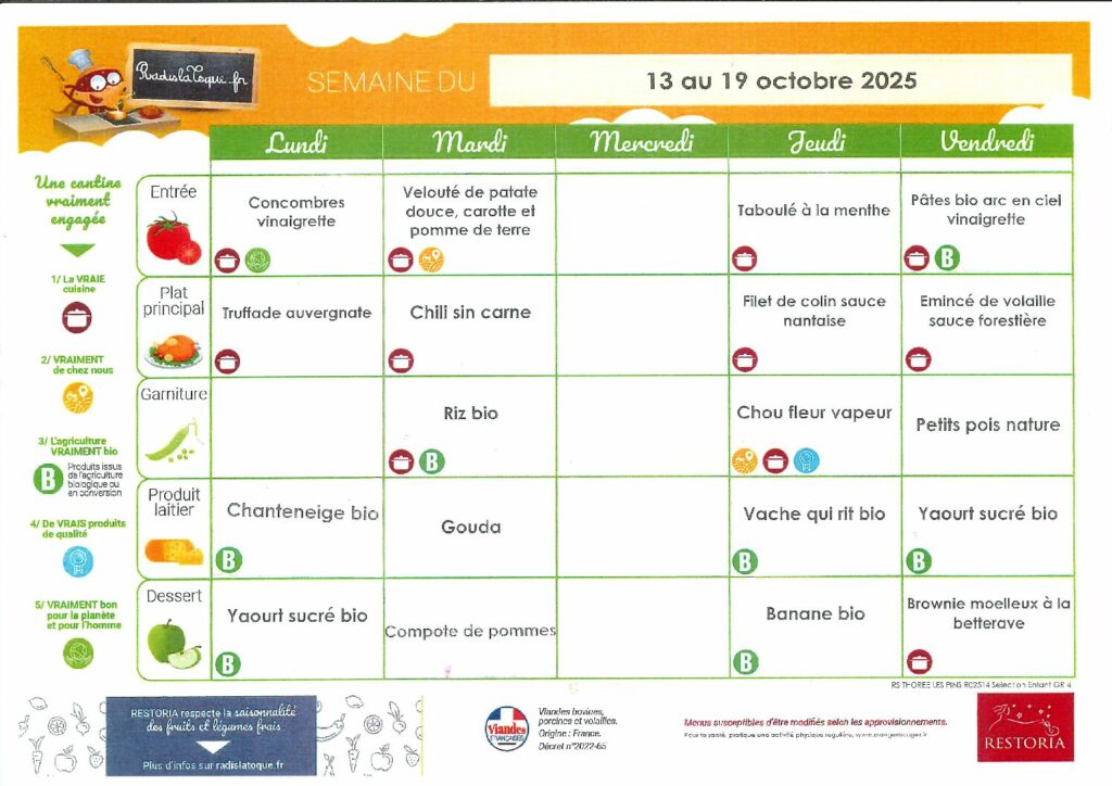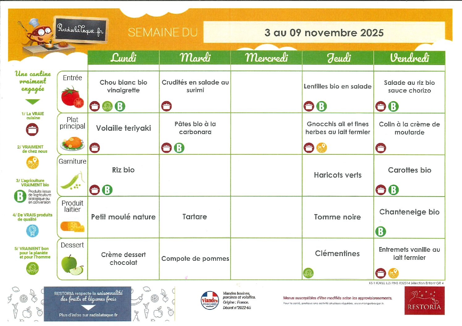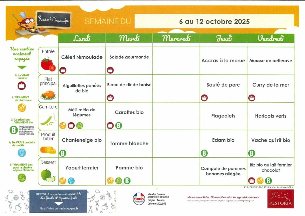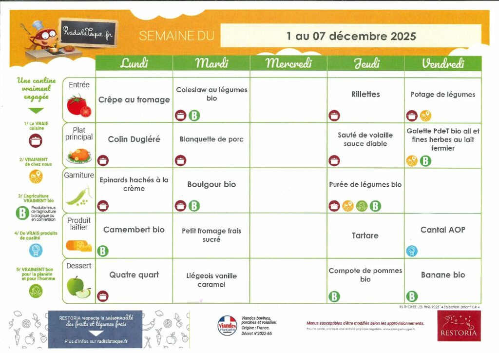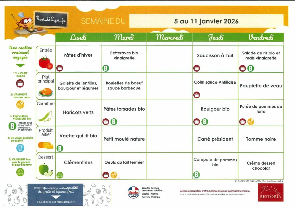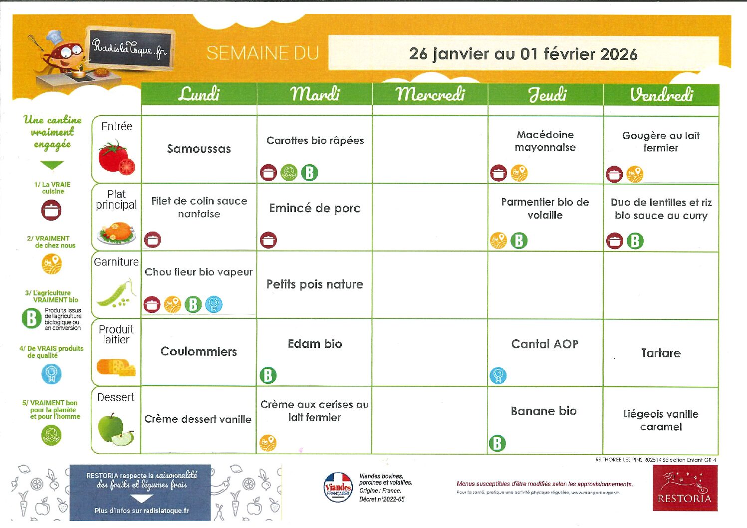 Menus : Le menu de la semaine est à retrouver ici chaque vendredi pour la semaine suivante.